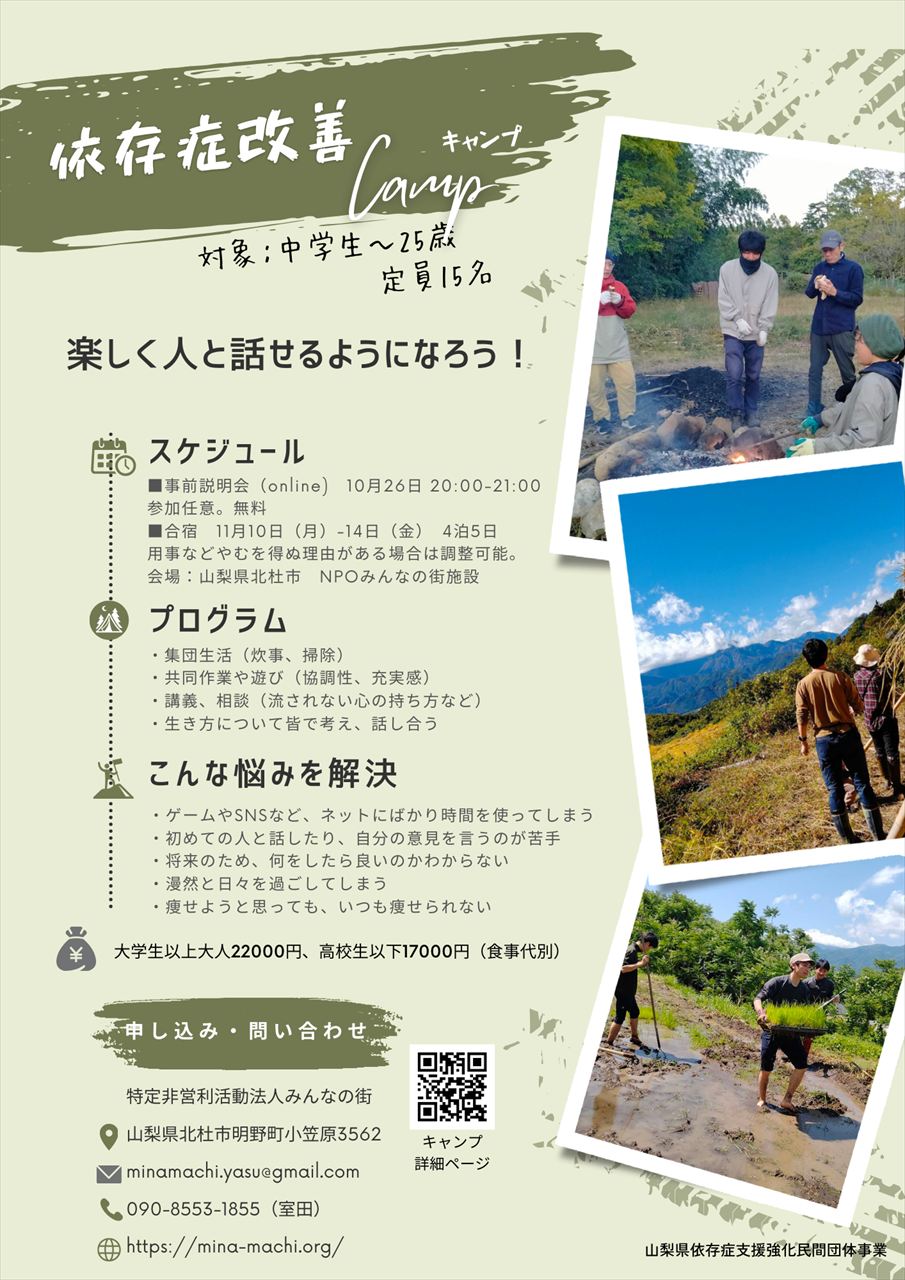 中学生~25歳対象でネット依存から脱却するための合宿を行います。